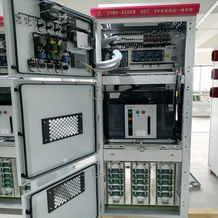 高壓啟動(dòng)柜工作原理:帶開關(guān)功能的高壓軟啟動(dòng)柜根據(jù)客戶的要求用真空接觸器或真空斷路器,且該設(shè)備具有高壓開關(guān)柜的所有功能,使得該設(shè)備可以和各種高壓開關(guān)柜一體并柜使用,軟起動(dòng)柜采用高質(zhì)量的串聯(lián)晶閘管,無級控制輸出電壓,使電動(dòng)機(jī)平穩(wěn)的起動(dòng)和停止。